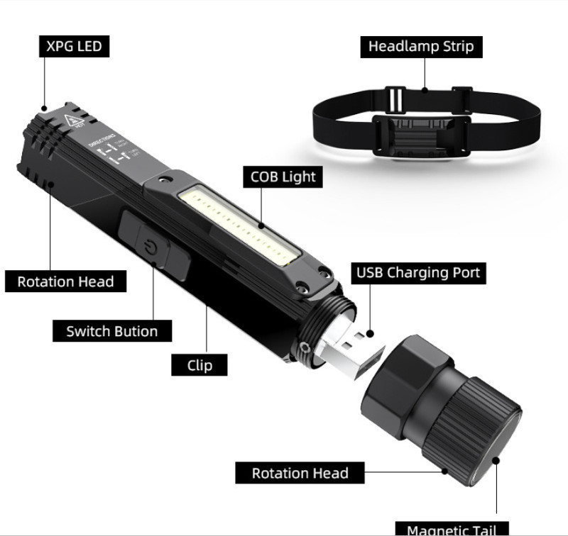 Kapriol multifunkcionalna led lampa G19 multifunkcionalna led svjetiljka G19 može se koristiti kao naglavna, ručna svjetiljka ili radna svjetiljka tehnički podaci 500 lumena snaga 5W udaljenost osvjetljivanja cca 100 metara namjena:za čitanje,popravke,kampiranje,radove,biciklizam težina 104 grama 1*14500 punjiva Li-ion baterija dimenzije 140x21x21 mm runtime:2-5 sati brzo punjenje , 5V USB charging port sa ugrađenim magnetom, mogućnost zakretanja 90 stepeni 5 načina rada (jako svjetlo,slabo svjetlo,bijelo COB svjetlo,crveno COB svjetlo,STROBE crveno svjetlo)